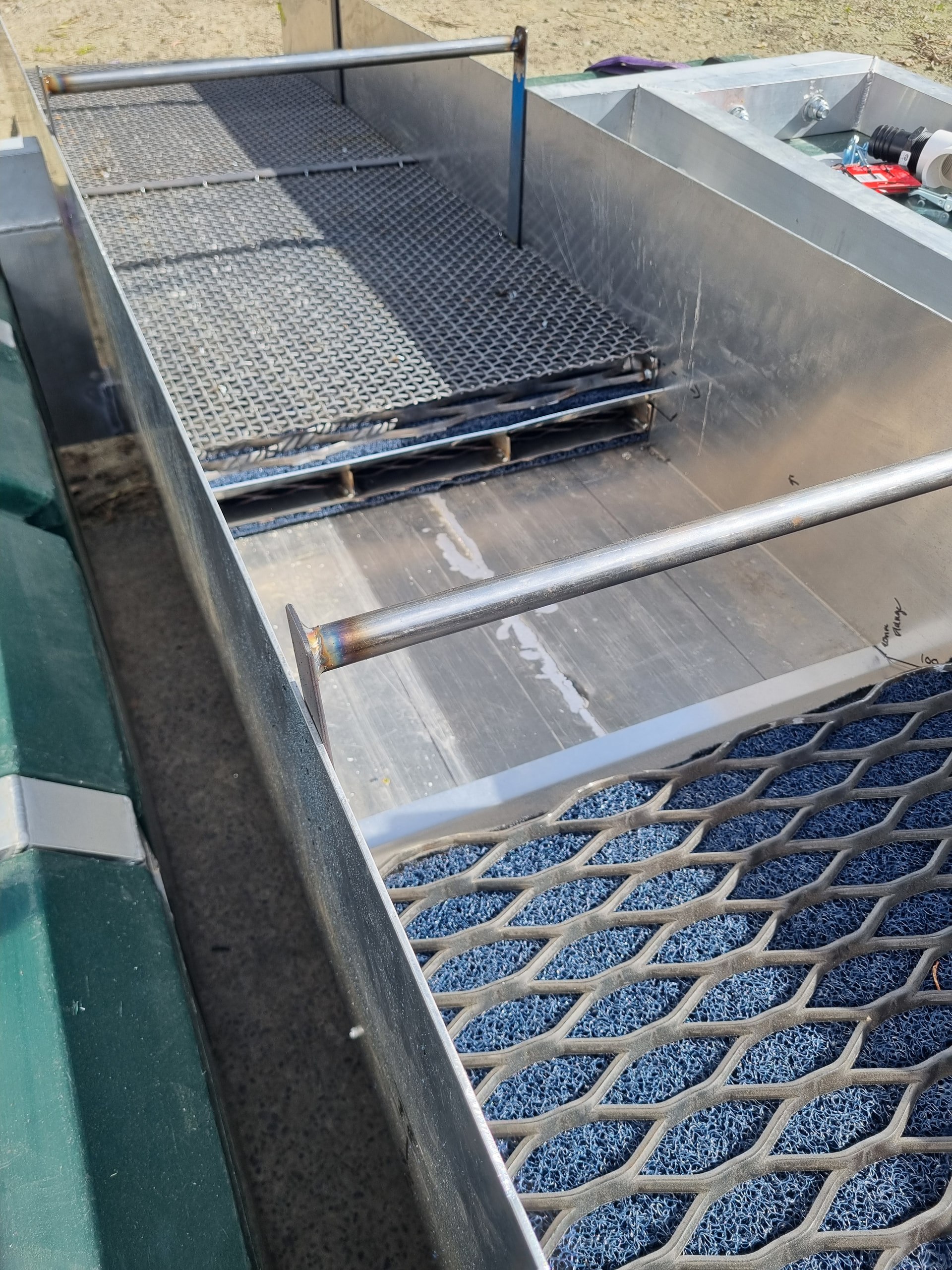 -woven mesh over expended metal for 3/4 of the sluice and riffle/nugget trap at the back, sitting on top of non-back moss with carpet under. Broken up into four sections for lite and easy clean ups and all head in with over-center latches (sluice is 2400x710mm)