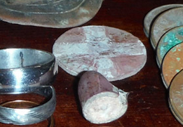 The large lead disc has been cast into some sort of pan, possibly a weighing pan off scales - Unfortunately the extent of text embedded in it only extends to "Patented " before being obscured.