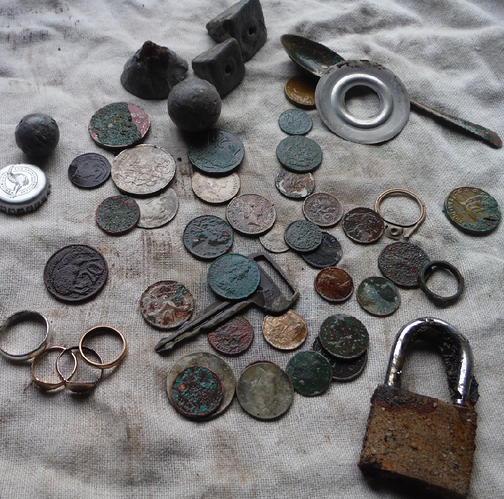 Final haul from just on a couple of hours - Surprised not more coins, but I suspect theyâve all been washed further down the beach and I was focussed on chasing gold tones anyway