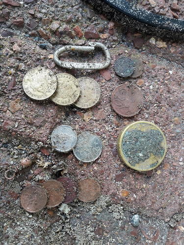 The early morning .2m tide gave up $9.70 and the brass wotzit. $2 missing from photo as i got a drink from the coke machine outside the club on my way home.
